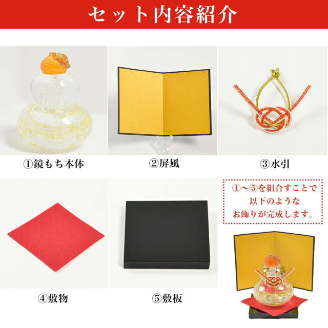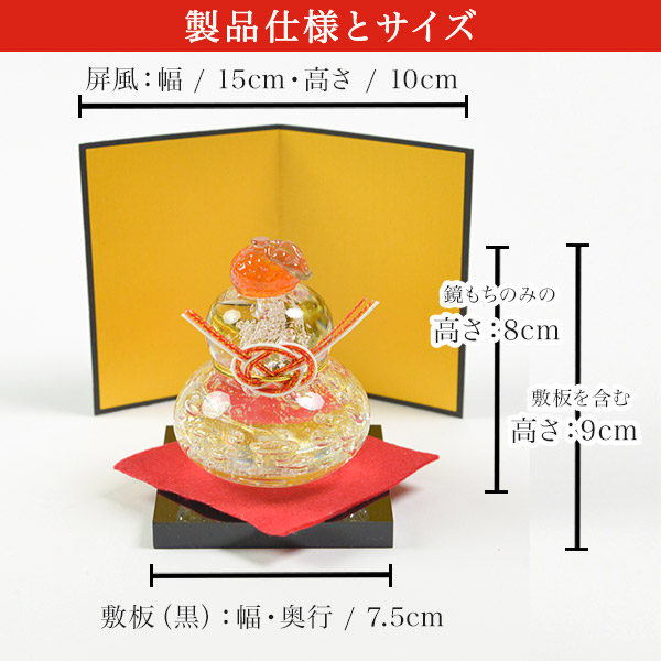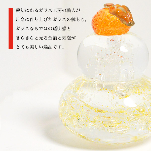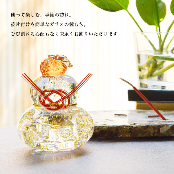 1点1点手作業で制作されたガラスの鏡もち。伝統的な鏡もちの形や意味合いを尊重しつつ、アートやインテリア等、新しいスタイルのお正月飾りとしてお楽しみいただけます。新年の運試し、縁起物入りおみくじ付きです。
