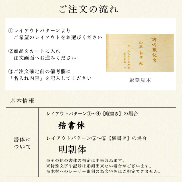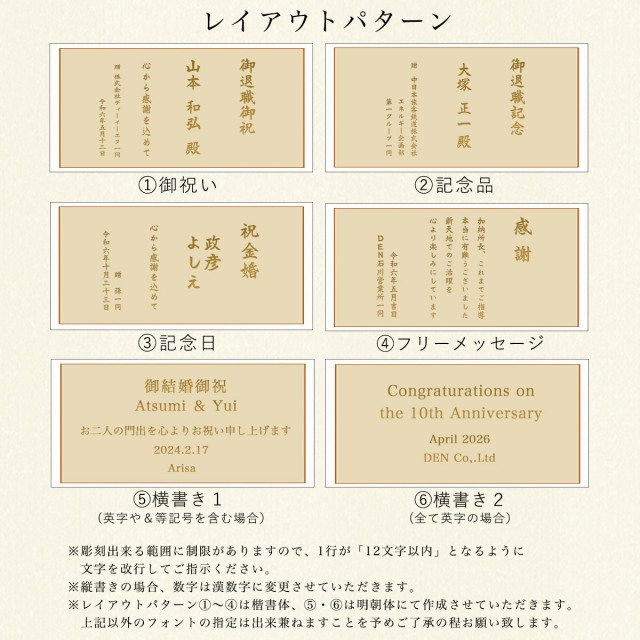 ※名入れ文字のレイアウトは店舗でバランスの良い配置をさせて頂きますのでご指定は出来兼ねます。