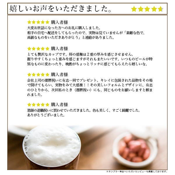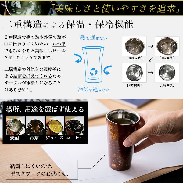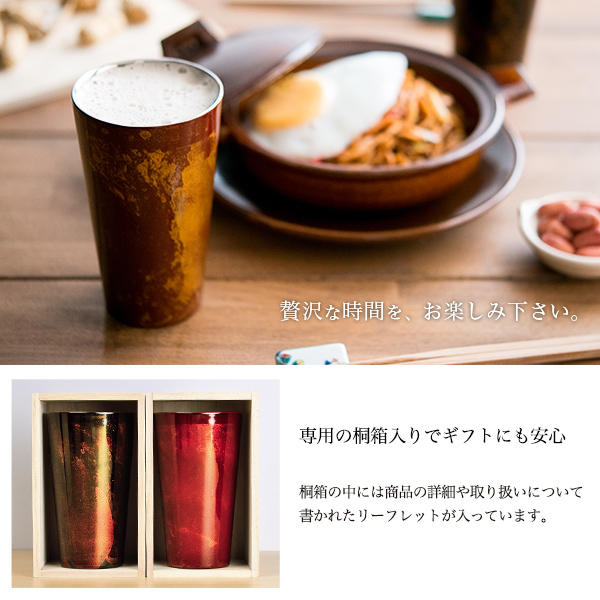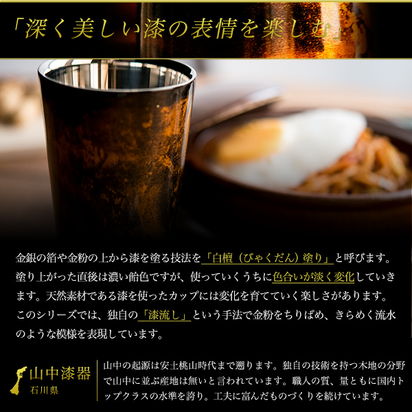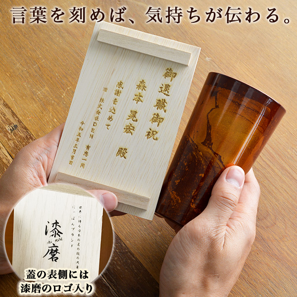 贈り物に人気のカップを木箱に入れ、お好みの言葉を木箱の蓋裏にレーザー彫刻してお届けします。山中漆器、越前和紙、燕三条の3つの技術が融合、見た目にも使い心地にもこだわった長く使える人気のカップ。2重構造で保温・保冷効果があり、結露の心配もありません。ビールやウイスキー、焼酎など幅広いシーンに使えます。外側の漆模様は使うにほどに色合いが美しく変化していくので、味わい深く、飽きが来ないのも魅力です。福井県の越前和紙を使用したコースター付き。