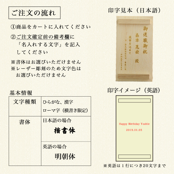 ※木の種類や節の有無により、レーザー印字の色の濃さに差が出る場合がございます。あらかじめご了承ください。