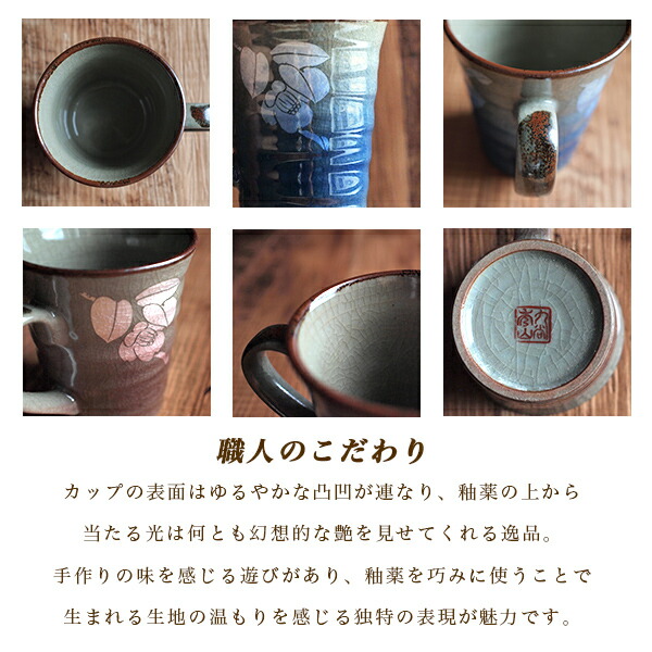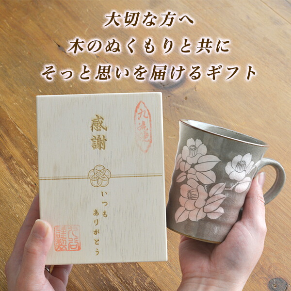 銀彩の淡い色合いと釉薬の艶やかさを際立たせるように波打つフォルムが上品な佇まいのマグカップです。飽きの来ない椿の絵付けと落ち着きのある色合いが、ご大切な記念日のプレゼントに人気のお品です。レーザー彫刻で木箱に思いを込めて、素敵な贈り物にいかがですか。