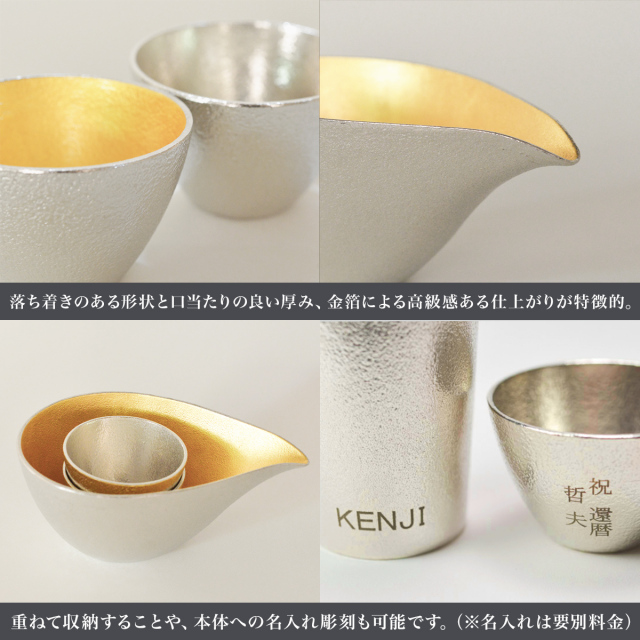 【高岡銅器】 片口 大 金箔 ぐい呑 錫 金箔 3ヶセット 桐箱入 名入れ彫刻料込み