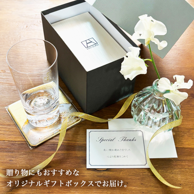 当店でも人気の高い、江戸硝子の富士山グラスシリーズ。熟練のガラス職人が手間暇かけて作り上げた江戸硝子はその緻密な技術によって、リアルな富士山の姿が再現されています。手にすれば、富士山の壮大さや美しさが伝わってきます。使い勝手の良いグラスとしても優れており、贈り物にも最適です。日本の伝統工芸品への興味をお持ちの方や、富士山を愛する方におすすめな心躍る逸品です。こちらはグラス1点・コースター1点の計2点セットで販売しております。