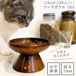 漆器ならではの美しい木目や漆の色つやが魅力的なペット用フードボウルです。内側にそりをつけて、こぼれにくい形状で、食べやすく吐き戻しもしにくい高さに。サイズは小・大2種類。ご飯の量や種類、ご家族のサイズでお好みの物をお選びください。本商品は手書き名入れサービス付きの商品です。購入ページの備考欄にお入れしたい名前をご記入してください。