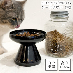 漆器ならではの美しい木目や漆の色つやが魅力的なペット用フードボウルです。内側にそりをつけて、こぼれにくい形状で、食べやすく吐き戻しもしにくい高さに。サイズは小・大2種類。ご飯の量や種類、ご家族のサイズでお好みの物をお選びください。本商品は手書き名入れサービス付きの商品です。購入ページの備考欄にお入れしたい名前をご記入してください。