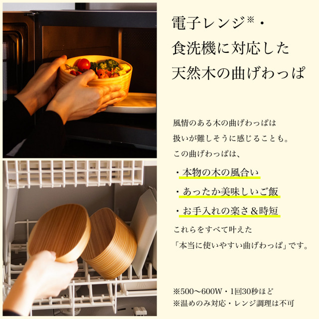 「ほんとうに使いやすい曲げわっぱ」が登場です。特許出願済のシーリング加工で木製でありながら「電子レンジ※」「食器洗浄機」が使えます。木製ならではの風合いと調湿機能は活かしながら、あたたかさも、洗い物の時短も叶えるアイテムです。※毎日2回30秒程度の加熱が可能です。決められたワット数と時間を守ってお使いいただくことで長くご愛用いただけます。