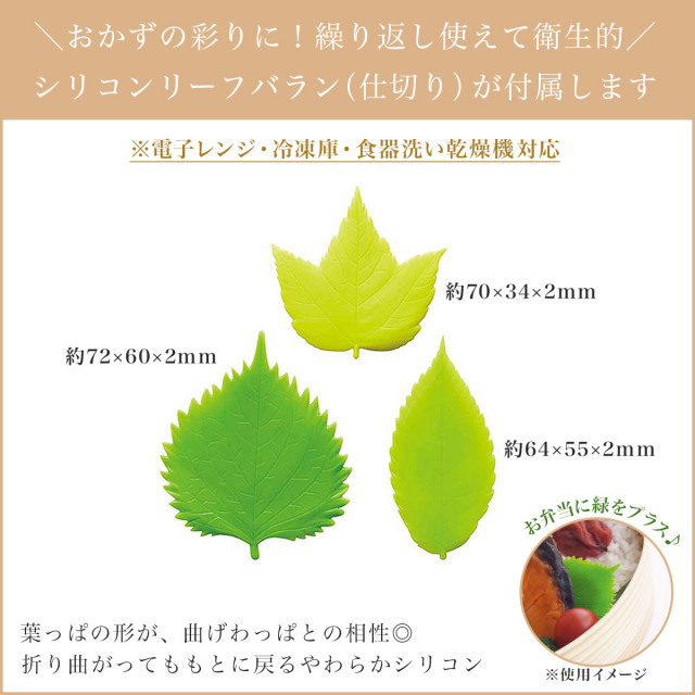 - ランチバンド、木製仕切り、シリコンリーフバランが付属します。