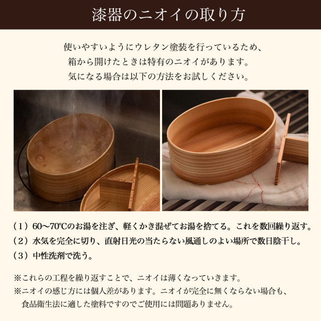 ・ 通常の曲げわっぱお弁当箱と比べて、隙間ができにくい構造を採用し強度・耐熱性の高いコーティングを施した。