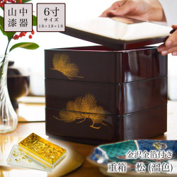 お正月やハレの日、行楽時にお使いいただける重箱と雑煮椀のセットです。蒔絵で描かれた美しい松が印象的で飽きることなく永くお使い頂ける逸品です。本商品は特別な日のお料理やおせち料理の飾りつけに使える食用金箔がセットになっております。セット内容【重箱1点 雑煮椀2点 金箔1点】