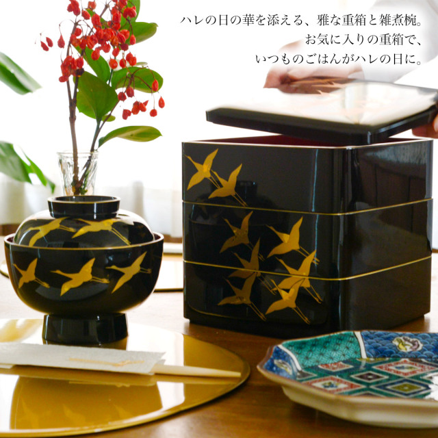 お正月やハレの日、行楽時にお使いいただける重箱と雑煮椀のセットです。蒔絵で描かれた美しい鶴が印象的で飽きることなく永くお使い頂ける逸品です。本商品は特別な日のお料理やおせち料理の飾りつけに使える食用金箔がセットになっております。セット内容【重箱1点 雑煮椀2点 金箔1点】
