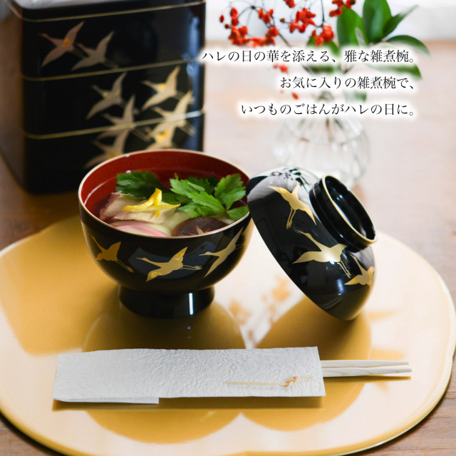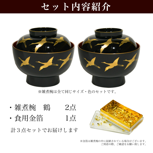 お正月やハレの日にお使いいただける雑煮椀です。蒔絵で描かれた美しい鶴が印象的で飽きることなく永くお使い頂ける逸品です。本商品は特別な日のお料理やお雑煮の飾りつけに使える食用金箔がセットになっております。セット内容【雑煮椀2点 金箔1点】