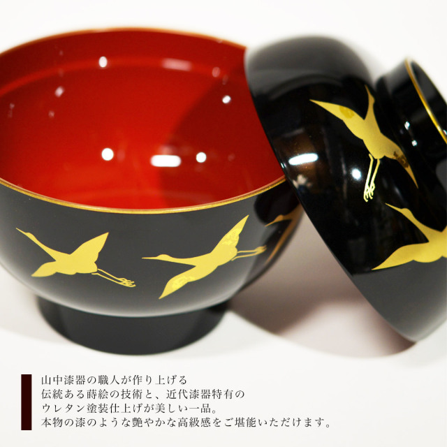 【山中漆器】 雑煮椀 鶴 黒 金沢金箔付き 2点セット