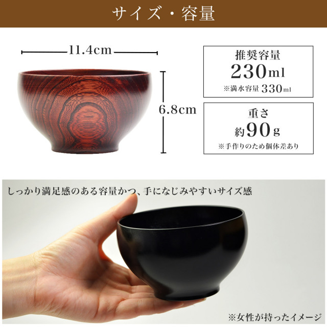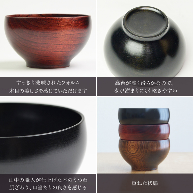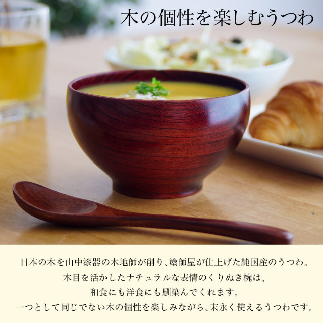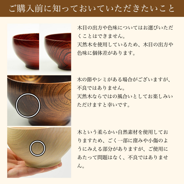 ※くりぬきのお椀ならではですが、経年の伸び縮みにより椀の円に若干の歪みが生じることがあります。天然木を使用した証としてお楽しみください。