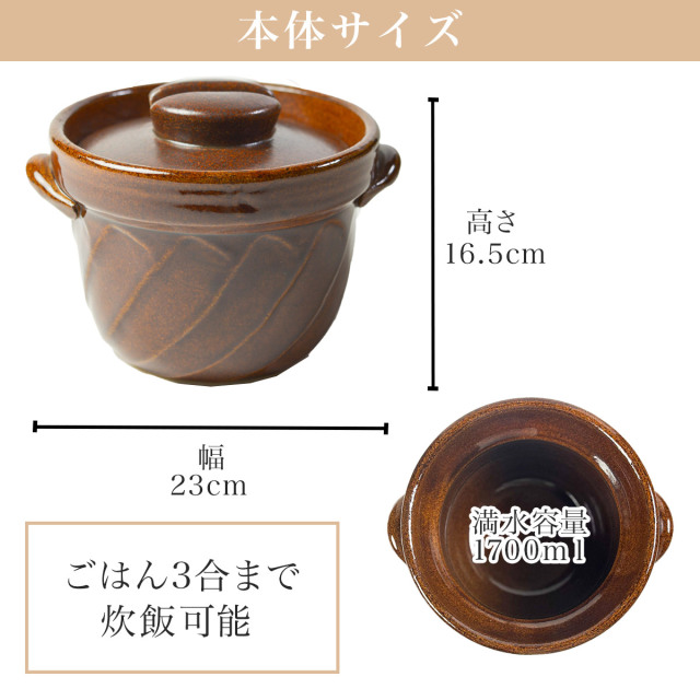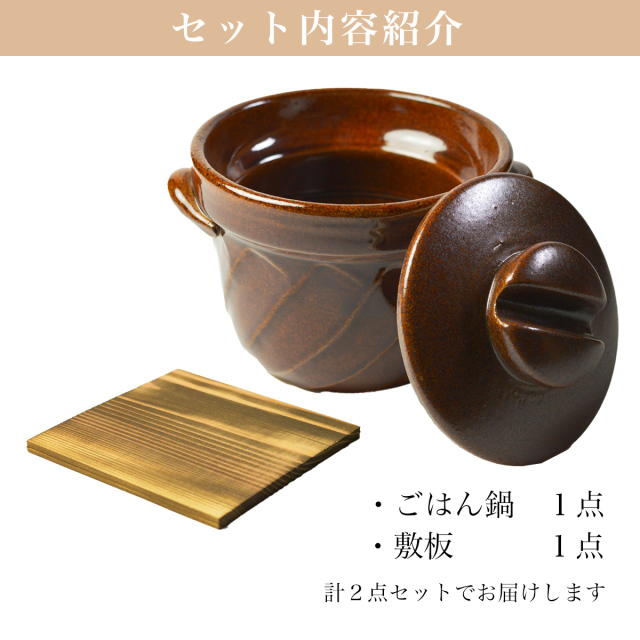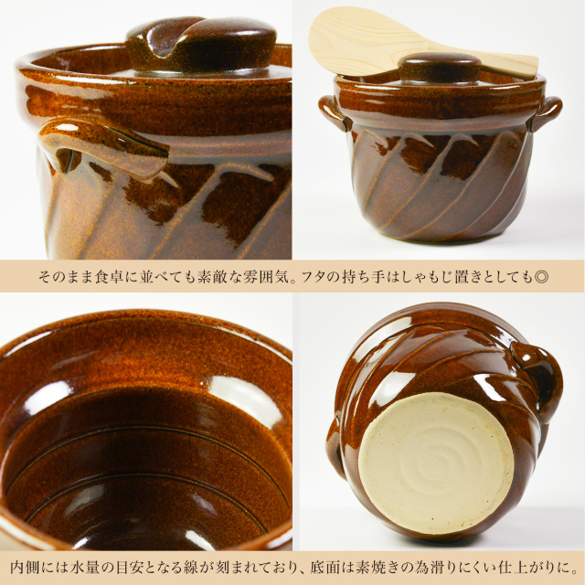 【萬古焼】 直火専用ご飯鍋 ねじれ 飴釉 レンジ対応 3合サイズ 鍋敷き付き
