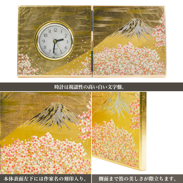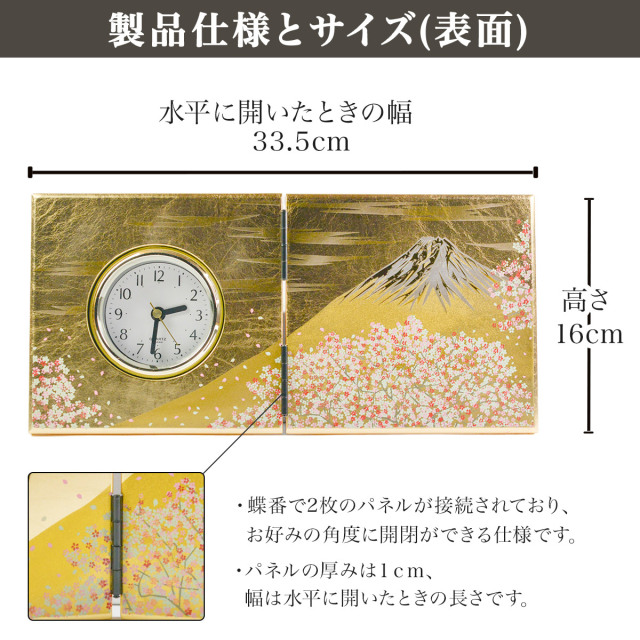 日本最高峰の山であり、日本文化の象徴として古くから親しまれている富士山と日本を代表する美しい桜のコラボレーション描かれた、見開きタイプの屏風時計(置時計)です。