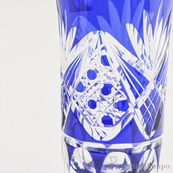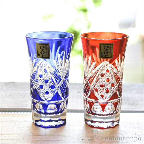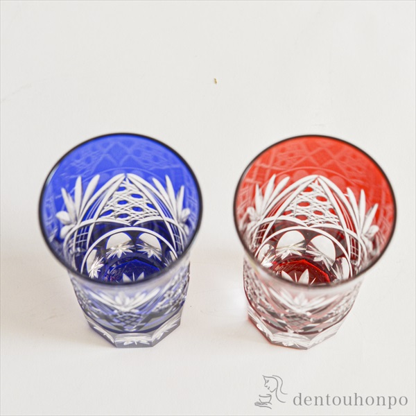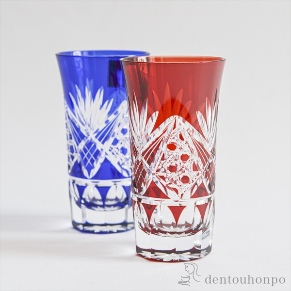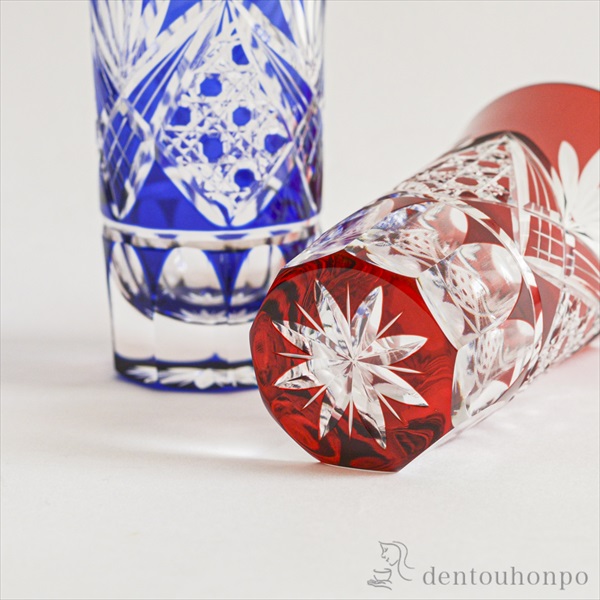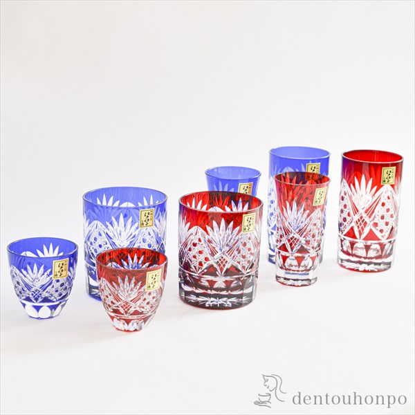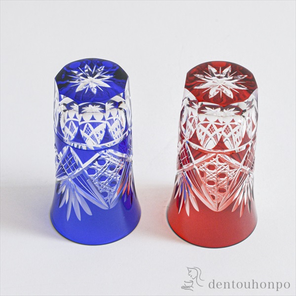 切子とは、砥石等の研磨材を用いて硝子器に彫り込まれたカット模様のことです。この技法は、江戸時代の後期より現代に伝えられてきた伝統工芸のひとつです。この硝子器は、江戸硝子吹き技法の色被せ硝子に、切子師の技が光り輝く手造りならではの工芸品です。