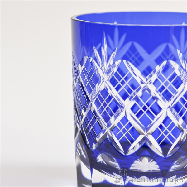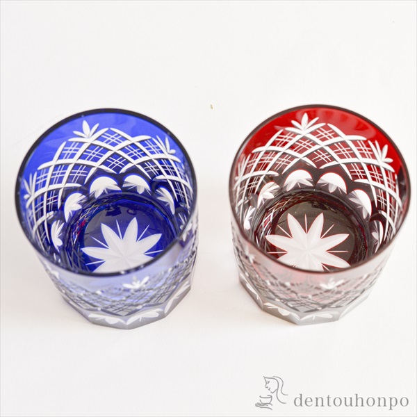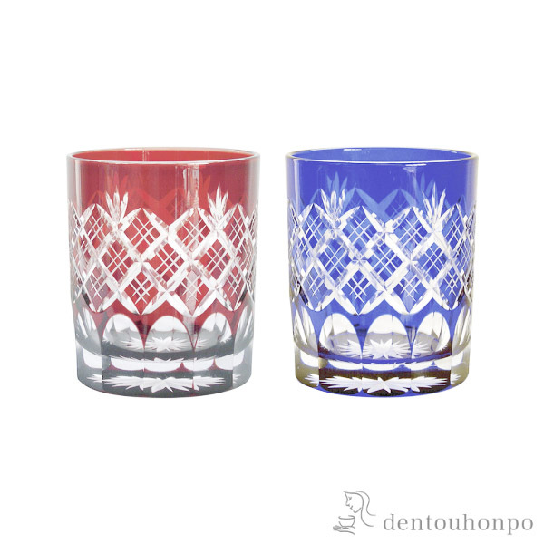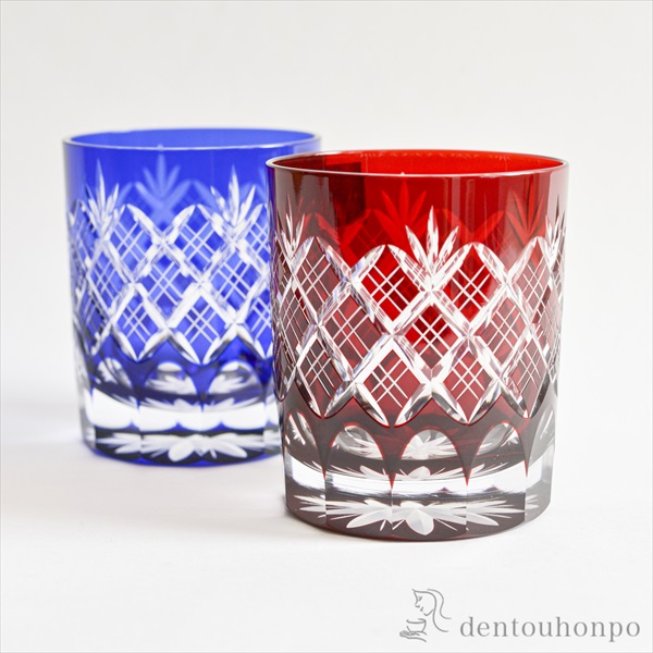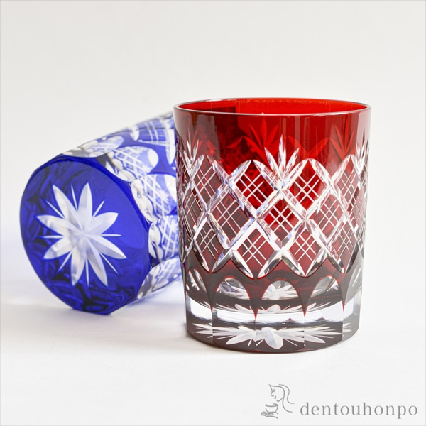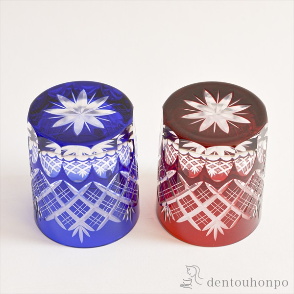 切子とは、砥石等の研磨材を用いて硝子器に彫り込まれたカット模様のことです。この技法は、江戸時代の後期より現代に伝えられてきた伝統工芸のひとつです。この硝子器は、江戸硝子吹き技法の色被せ硝子に、切子師の技が光り輝く手造りならではの工芸品です。