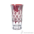 切子とは、砥石等の研磨材を用いて硝子器に彫り込まれたカット模様のことです。この技法は、江戸時代の後期より現代に伝えられてきた伝統工芸のひとつです。この硝子器は、江戸硝子吹き技法の色被せ硝子に、切子師の技が光り輝く手造りならではの工芸品です。