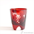 切子とは、砥石等の研磨材を用いて硝子器に彫り込まれたカット模様のことです。この技法は、江戸時代の後期より現代に伝えられてきた伝統工芸のひとつです。この硝子器は、江戸硝子吹き技法の色被せ硝子に、切子師の技が光り輝く手造りならではの工芸品です。