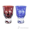 切子とは、砥石等の研磨材を用いて硝子器に彫り込まれたカット模様のことです。この技法は、江戸時代の後期より現代に伝えられてきた伝統工芸のひとつです。この硝子器は、江戸硝子吹き技法の色被せ硝子に、切子師の技が光り輝く手造りならではの工芸品です。