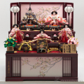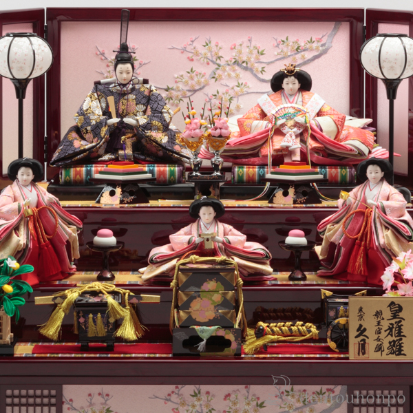 西陣織の有職柄が高貴な収納五人飾りです。人気のある飾りやすい大きさです。十二単をお召しになったお雛様・お内裏様に三人官女を加えた五人飾りはしっかりとした存在感があり、三段飾りは収納ケースとしてもご利用いただけるので、しまう際も便利です。春らしい色彩の屏風と衣装着が愛らしいセットです。