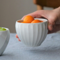 素焼前の生の生地をカンナで一刀一刀削る造形美。カンナ道具や彫りの圧が、それぞれの表情を刻みます。ドリンクだけでなくデザートやスープの器にも活躍しそう。カンナで削った分だけ軽く、また光にかざすと透けたように見えます。キャンドル入れにもお使いいただけます。