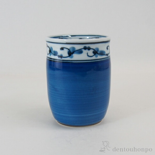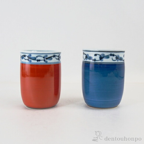 磁器製なので扱いやすく、電子レンジでも使用できる湯呑。 お茶の色も味のうち。色も楽しめるよう、内側は白色でお茶の色が見やすいです。赤と青の2色展開。同柄のお茶碗も販売中です。