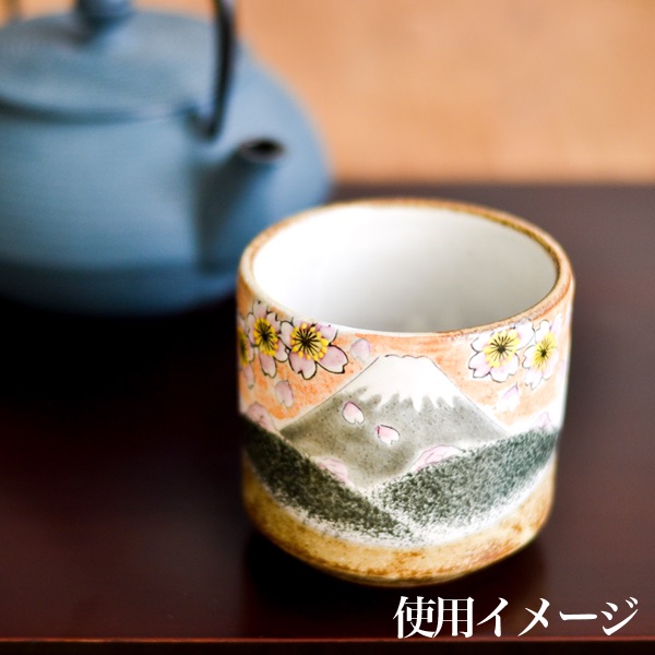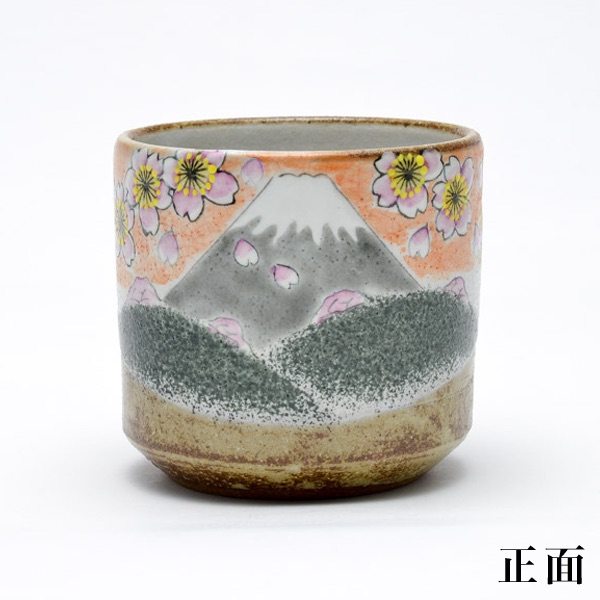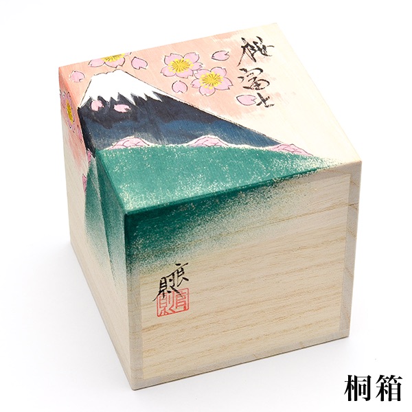 当店で定番人気の色いろカップ。使いごこちを追求した九谷和窯の生地に、縁起のよい富士山が描かれています。日本の美しい「春の富士」が描かれており、季節感を味わえるのも嬉しいポイント。カップと箱の絵付けは九谷焼作家の福田良則さんにお願いしました。