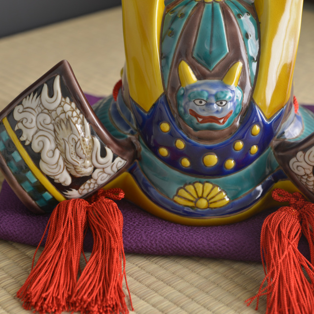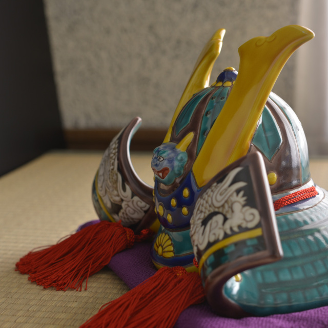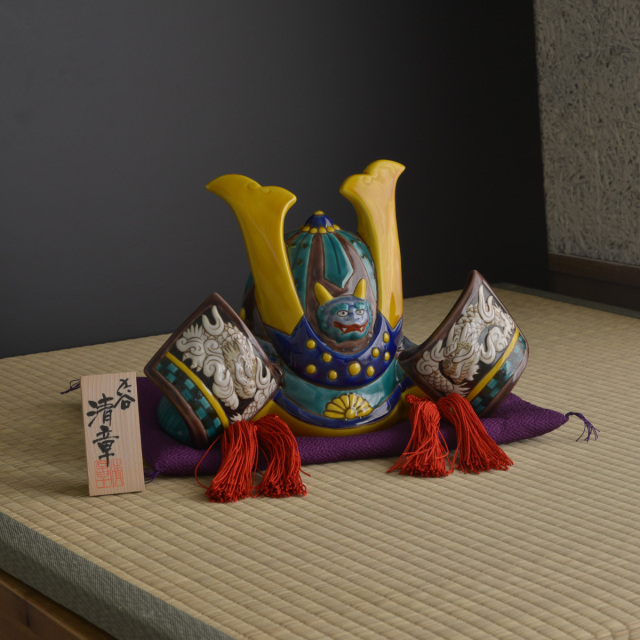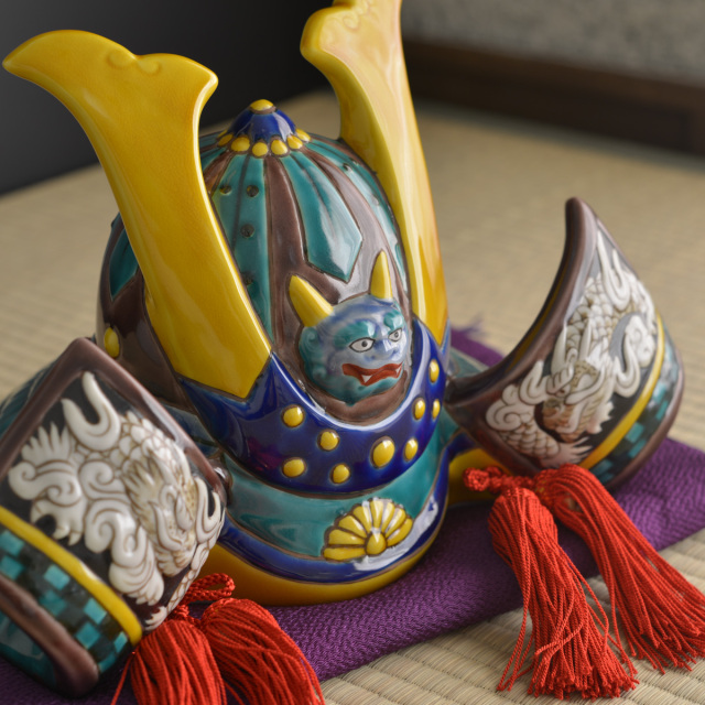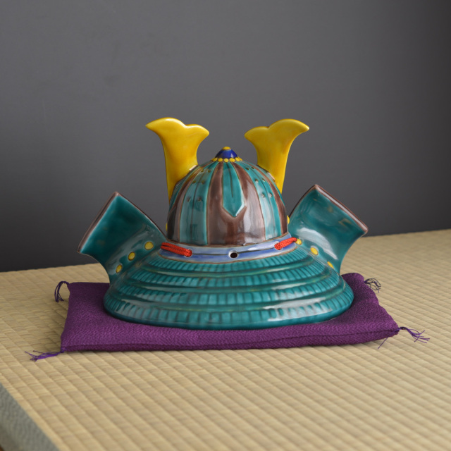 青と緑を基調とした色鮮やかな九谷焼の兜です。陶器の武者人形・兜はお手入れが簡単で省スペースで飾りやすいので現代の生活空間にマッチします。お子様・お孫様の節句お祝いに喜ばれる、職人の手作り感溢れる一品です。