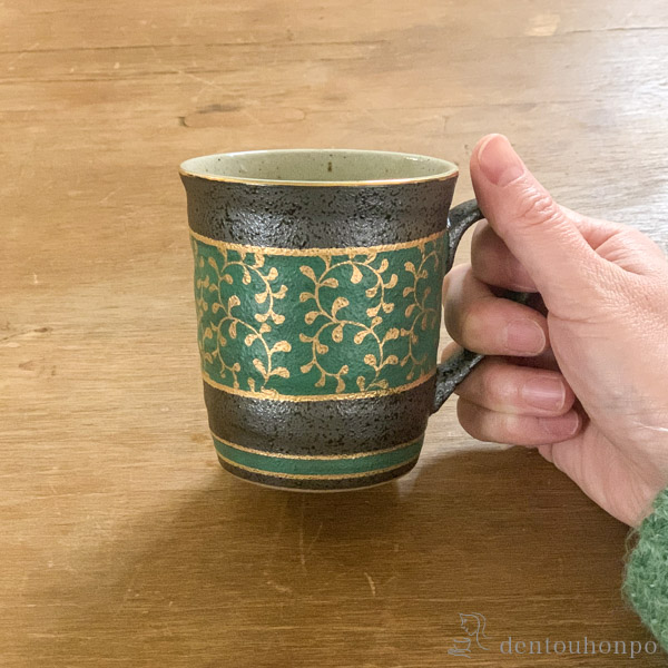 金唐草の柄が美しい、九谷焼のマグカップ。温かなお茶やコーヒーを飲むとき、その風情あるデザインで心が癒されます。手に持ったときの質感には、職人の技が宿ります。どんな飲み物も、このマグカップからいただくと特別な気持ちになること間違いなし。自宅用はもちろん、大切な方への贈り物としても喜ばれる逸品。日常に華やかさをプラスしたい方にぜひオススメしたい逸品です。