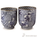 菊花模様に彫られた生地が手に良くなじみます。祥瑞・山水・花鳥・松竹梅と染付の絵柄を集めた壹楽窯の一品です。
