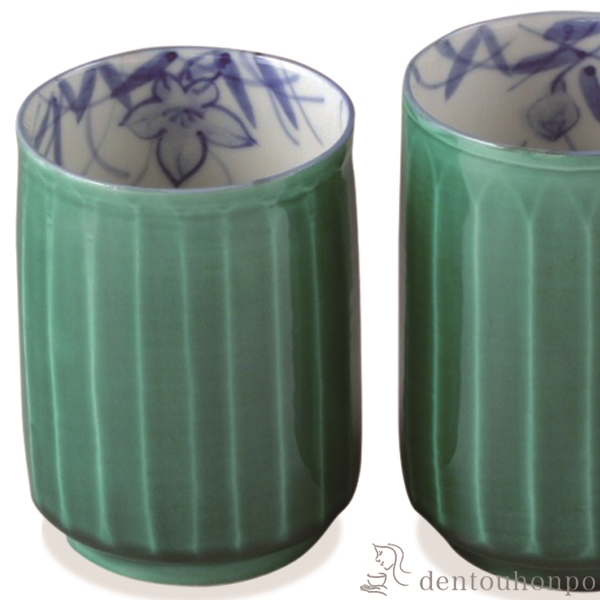 端正な器形に深みのある交趾の緑が映えるモダンな雰囲気の湯呑。中の縁まわりには柔らかなタッチの草花が描かれています。