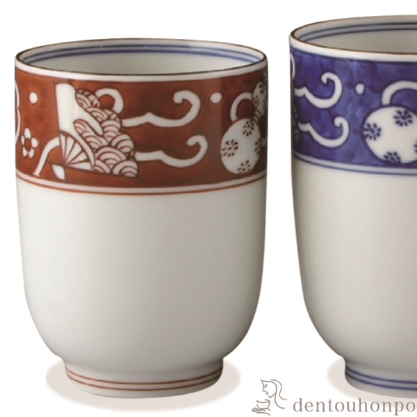 扇、瓢箪、七宝と吉祥の絵柄を描きました。シンプルながら、どこか懐かしさを覚える湯呑です。贈り物にも喜ばれます。