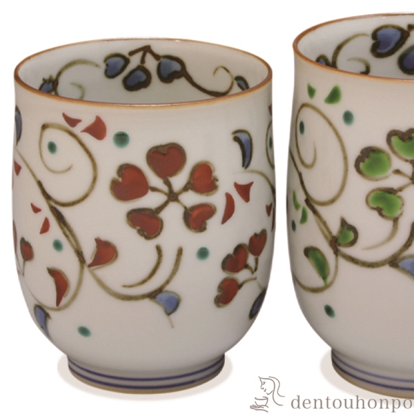 縁起の良い唐草模様が踊るように描かれています。ギフトに最適の、色鮮やかな湯呑です。