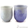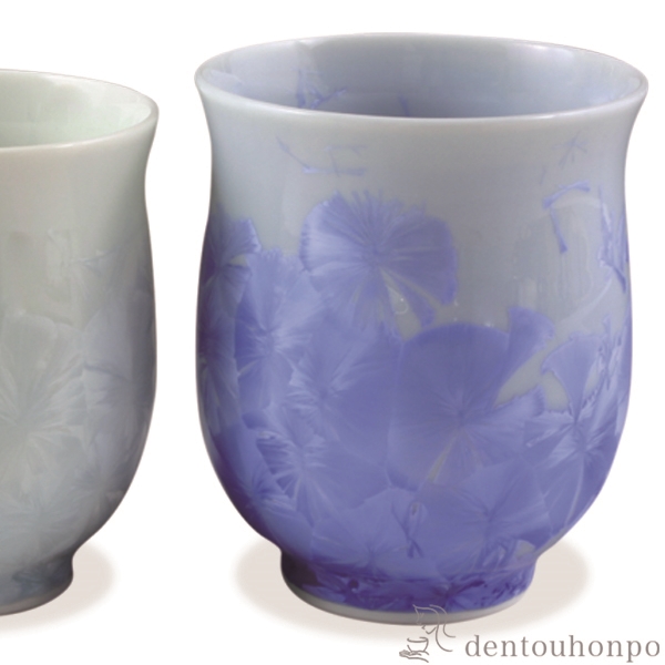 青色と白色の組合せが爽やかな湯呑です。柔らかな器のフォルムに結晶釉が良く映えています。器の表面に花が咲いたような美しい器で、2つとして同じものができないのも特徴のひとつです。様々な結晶の形を楽んでいただける商品です。