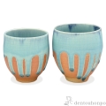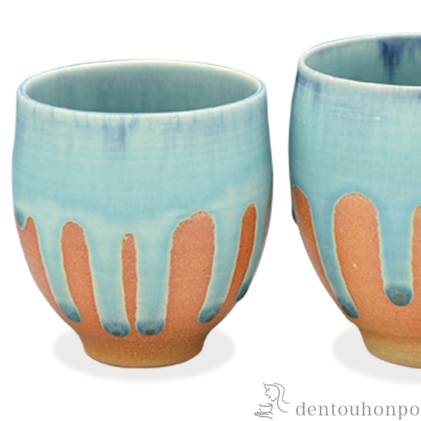 空や海を想わせるような青い釉薬と緋色釉との対比が美しい湯呑です。釉薬の流れる様が器に変化を与えています。