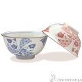 小花と小紋を風ぐるまのように描いた愛らしい飯碗です。染赤のペアは贈り物として喜ばれます。