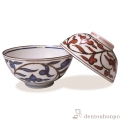 鉄絵で縁取った唐草が味わい深い飯碗です。赤・青ペアでお揃いの湯呑と合わせて贈り物にも喜ばれます。