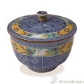 細かく描かれた染付の藍に色鮮やかな交趾の対比が美しいお茶呑茶碗。吉祥尽しの紋様で、おめでたい器です。