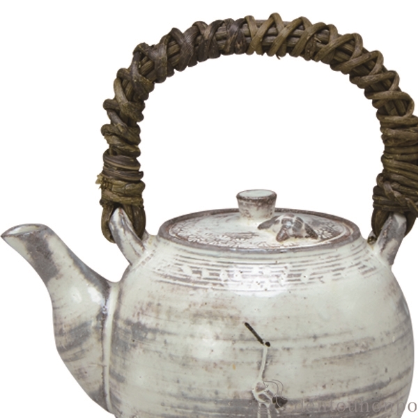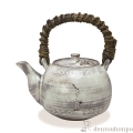 胴には鶴の刻印が、蓋に亀の貼付紋が乗った味わい深い土瓶。天然の藤蔓を用いた取っ手の弦も魅力です。