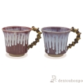 紫と赤に重ねて掛けられた白釉の流れが、味わい深いペアのマグカップです。リアルに作り込まれた取っ手が見どころです。