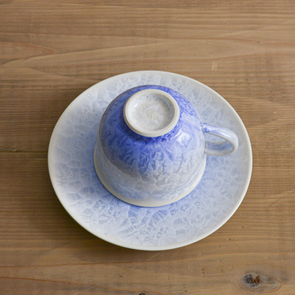 見る角度により様々な表情を見せる結晶釉に、青のぼかしを加えました。爽やかな印象の碗皿です。器の表面に花が咲いたような美しい器で、2つとして同じものができないのも特徴のひとつです。様々な結晶の形を楽んでいただける商品です。