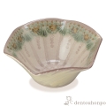 吉祥文様とされる瓔珞紋を、亀甲型の鉢に表しました。淡い緑と茶の差し色が新鮮です。