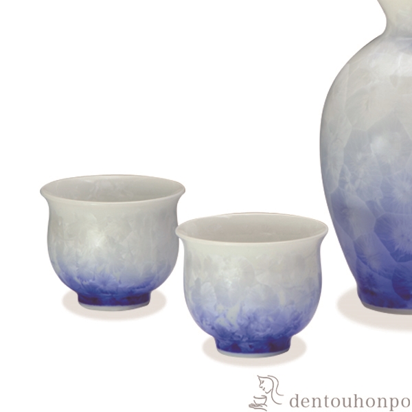 白と青のグラデーションが美しい結晶釉の酒器です。窯の中で生まれた様々な形状の結晶がお酒を華やかに彩ります。器の表面に花が咲いたような美しい器で、2つとして同じものができないのも特徴のひとつです。様々な結晶の形を楽んでいただける商品です。