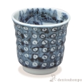 指すじがつけられた素地に染付で鹿の子模様や山水図が描かれています。染付の濃淡が味わい深いぐい呑です。