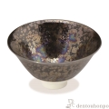深い黒地に現れた虹彩や銀色の結晶が美しい盃です。窯の中で変化した銀河を想わせるような奥深い釉薬の表情が印象的です。