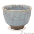 青瓷釉の青色と、縦横無尽に走る貫入が味わい深い趣を感じさせるぐい呑です。