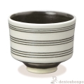 一定のリズムで施された黒線が白地によく映えています。高台が少し小さめで、現代的な形状のぐい呑です。