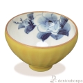 目に鮮やかな黄交趾の色目と、染付で描かれた椿が対照的なぐい呑です。胴に施されたソギがアクセントになっています。