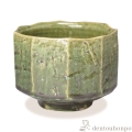 荒土の素地に、力強い面取りを施し、堂々と風格のある形状に仕上げています。織部の釉調や土味など見所の多い抹茶 です。